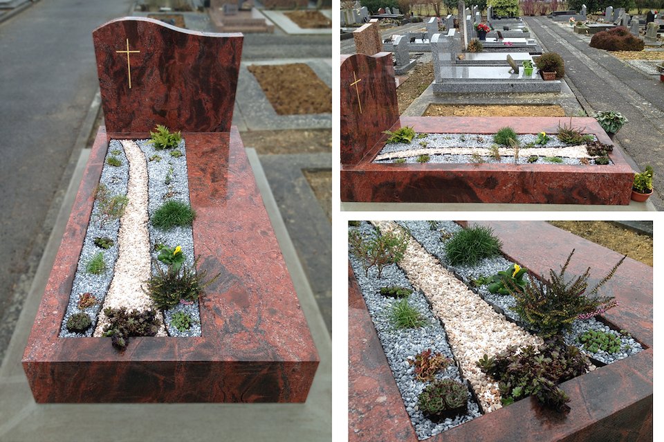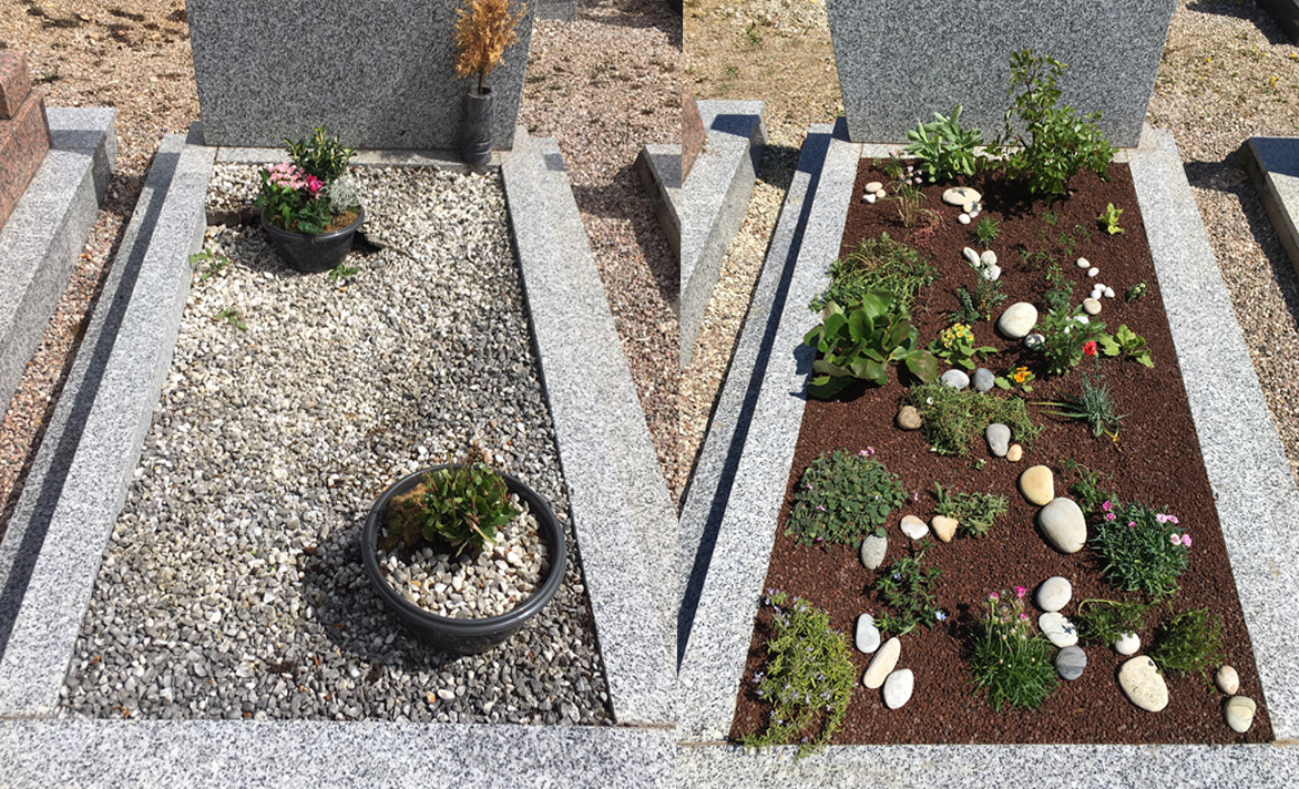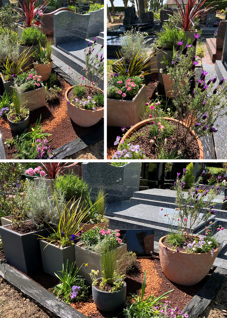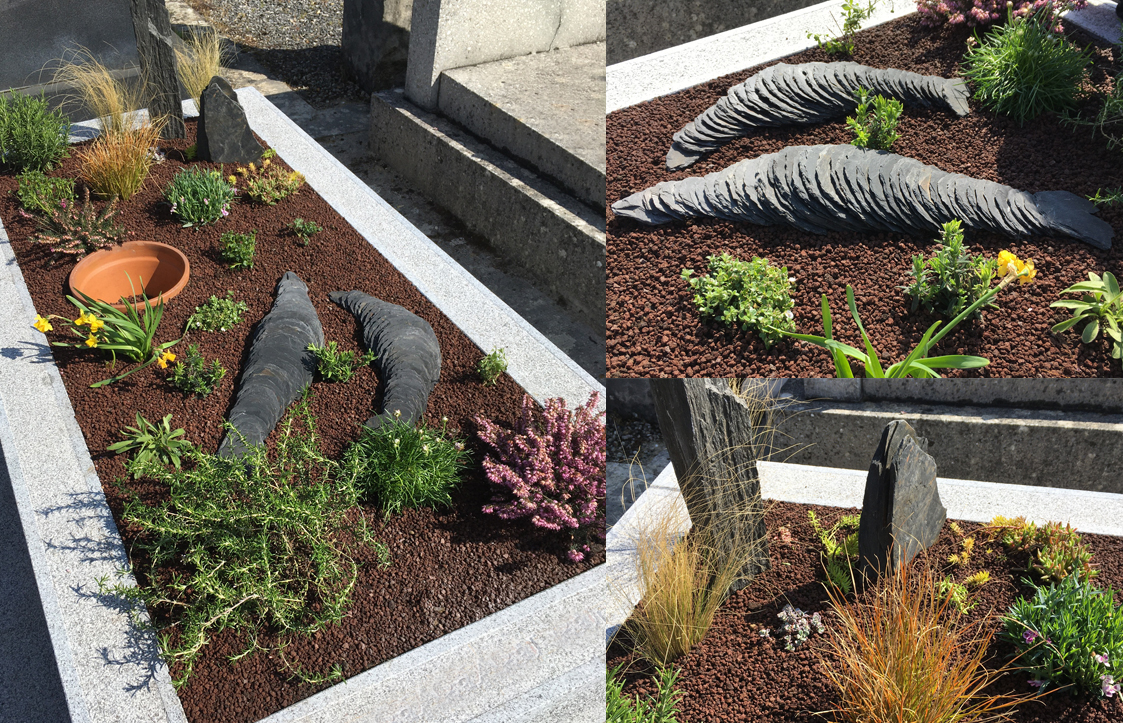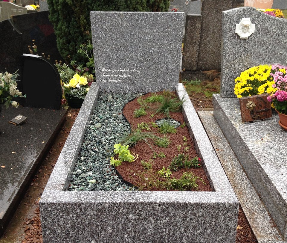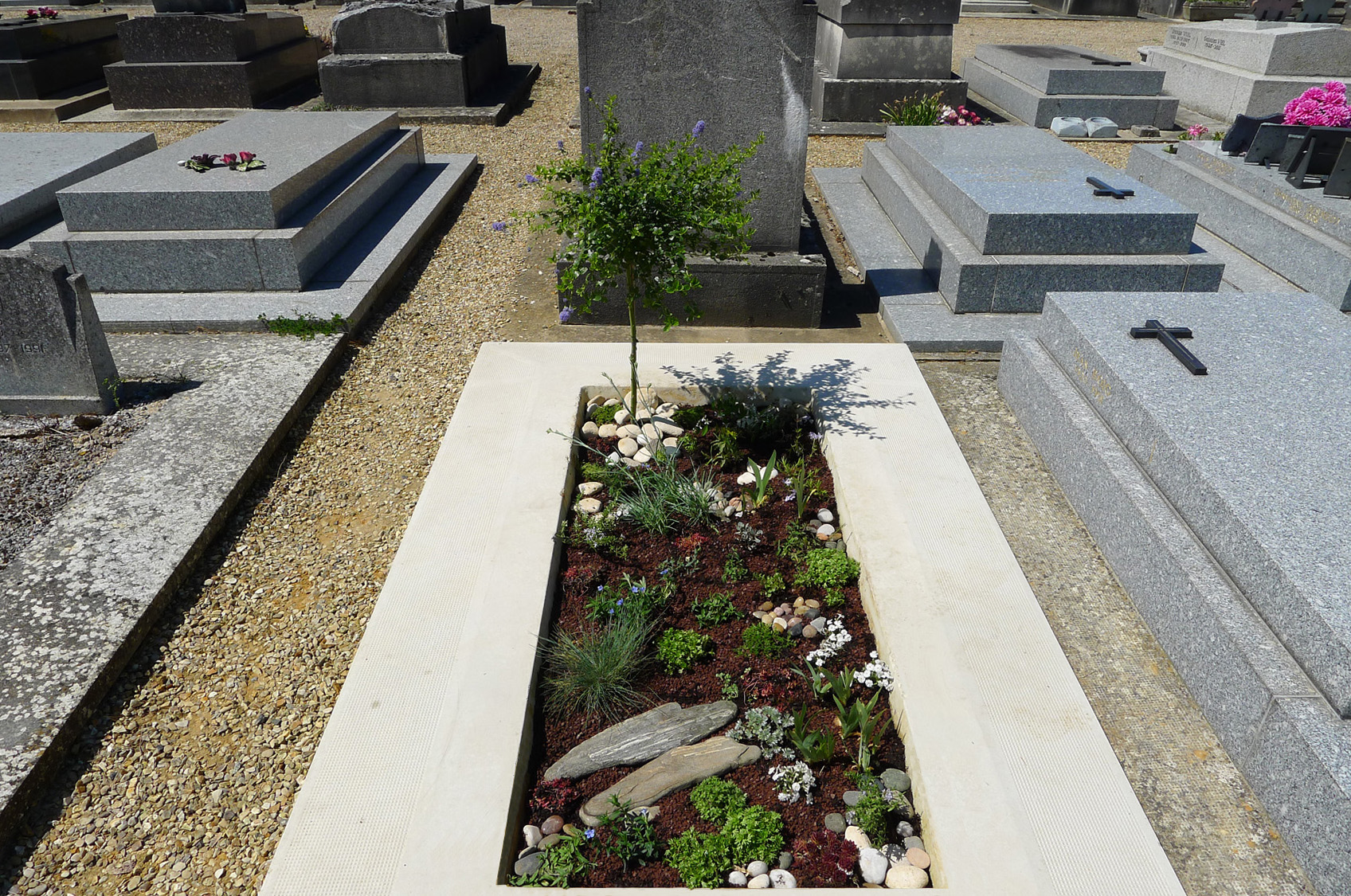 Sur caveau ou en pleine terre, la sépulture paysagère est plantée directement dans la semelle (entourage au sol) ou bien dans un soubassement (monument sur dalle). Entièrement personnalisé, chaque jardin sur tombe est différent et s’adapte aux souhaits des proches comme à l’environnement qui l’accueille. Un jardin sur tombe est autorisé dans tous les cimetières.