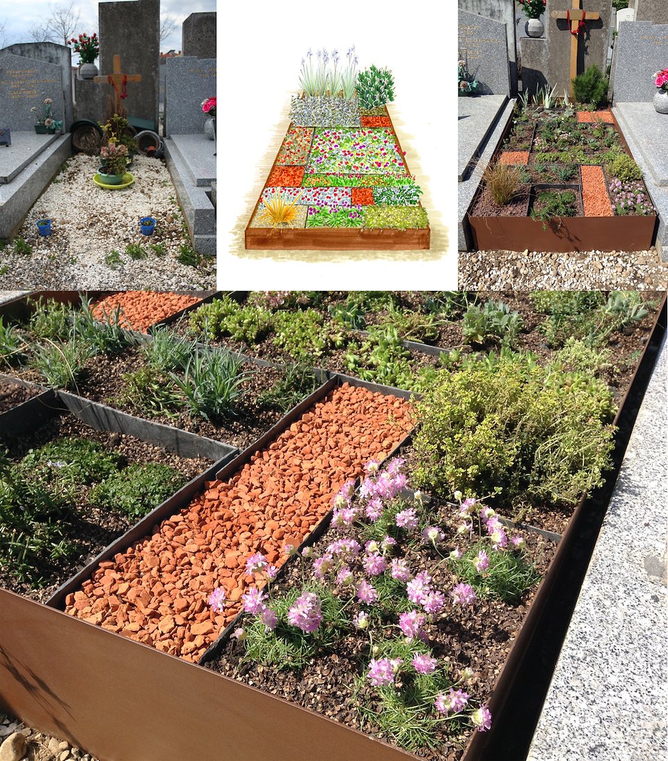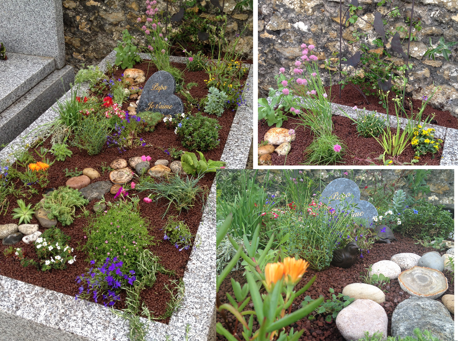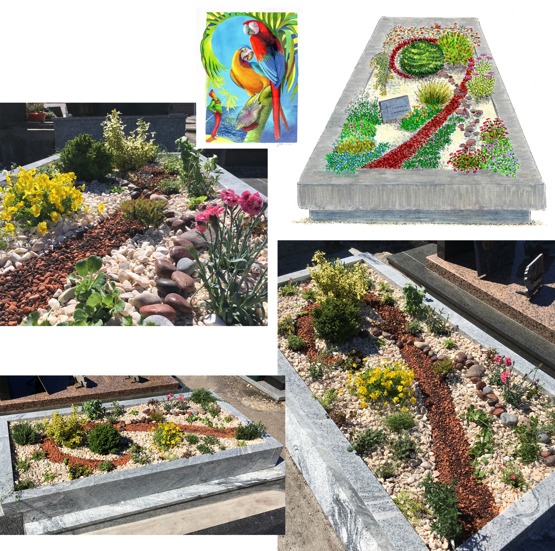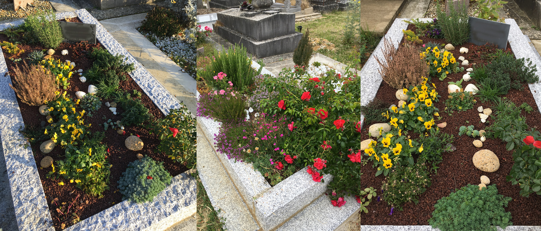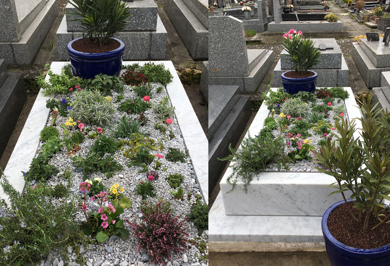 Sur caveau ou en pleine terre, la sépulture paysagère est plantée directement dans la semelle (entourage au sol) ou bien dans un soubassement (monument sur dalle). Entièrement personnalisé, chaque jardin sur tombe est différent et s’adapte aux souhaits des proches comme à l’environnement qui l’accueille. Un jardin sur tombe est autorisé dans tous les cimetières.