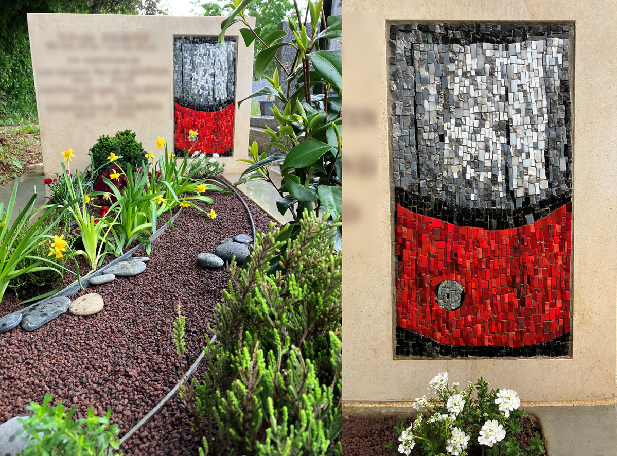 Sur la stèle, une création en mosaïque arrive visuellement en bout de lignes pour évoquer un tramway cher au défunt. Sépulture en pleine terre. Bagneux - Mai 2023