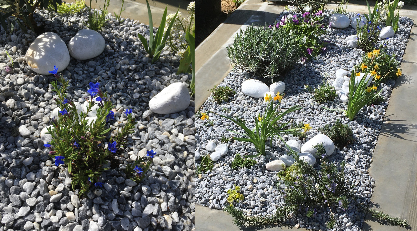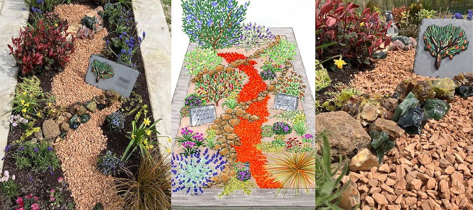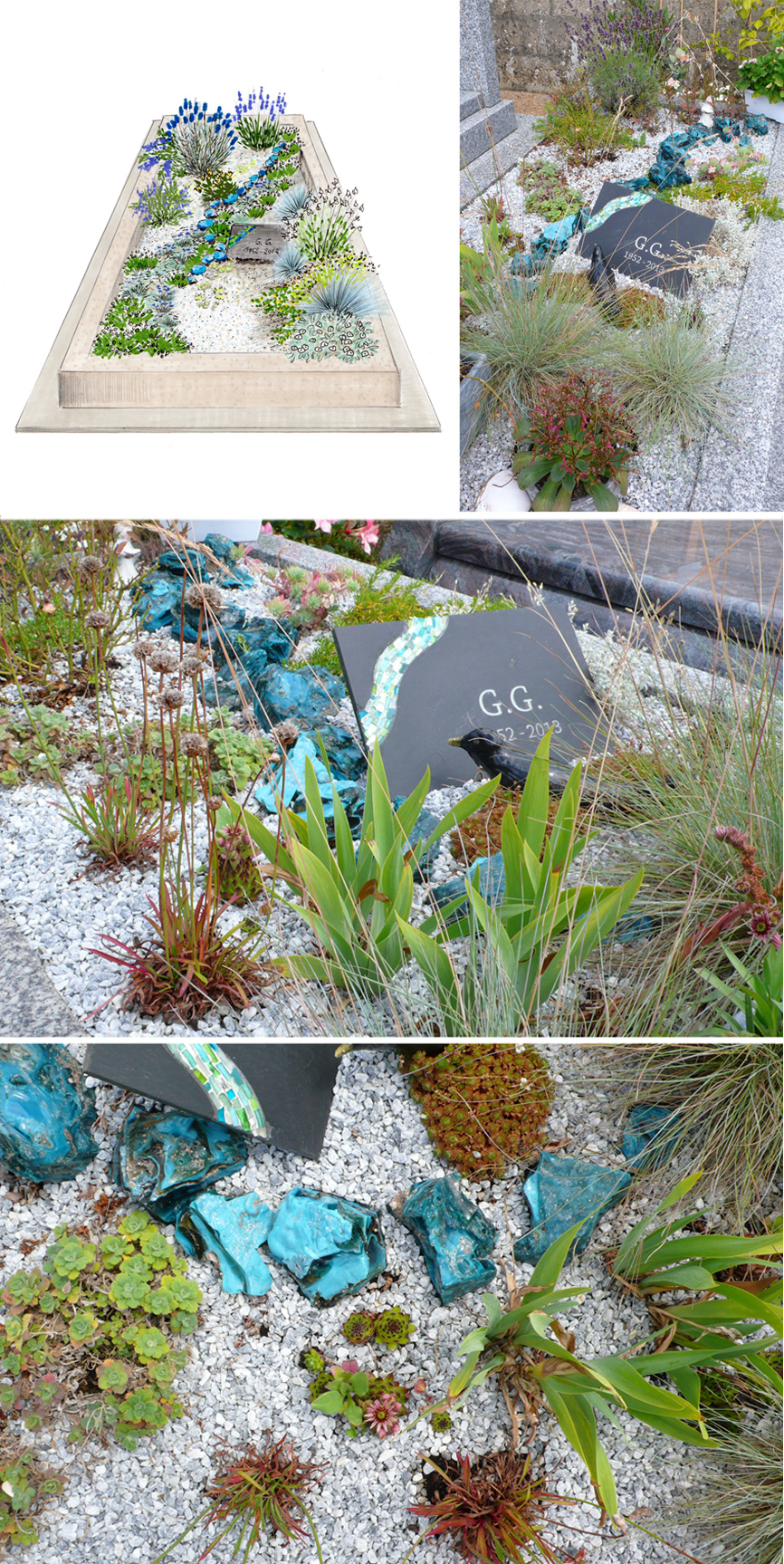 Un chemin planté de bulbes, dont la forme rappelle celle d’une guitare, en hommage aux qualités de musicien de la personne disparue, sépare le jardin minéral du jardin végétal.