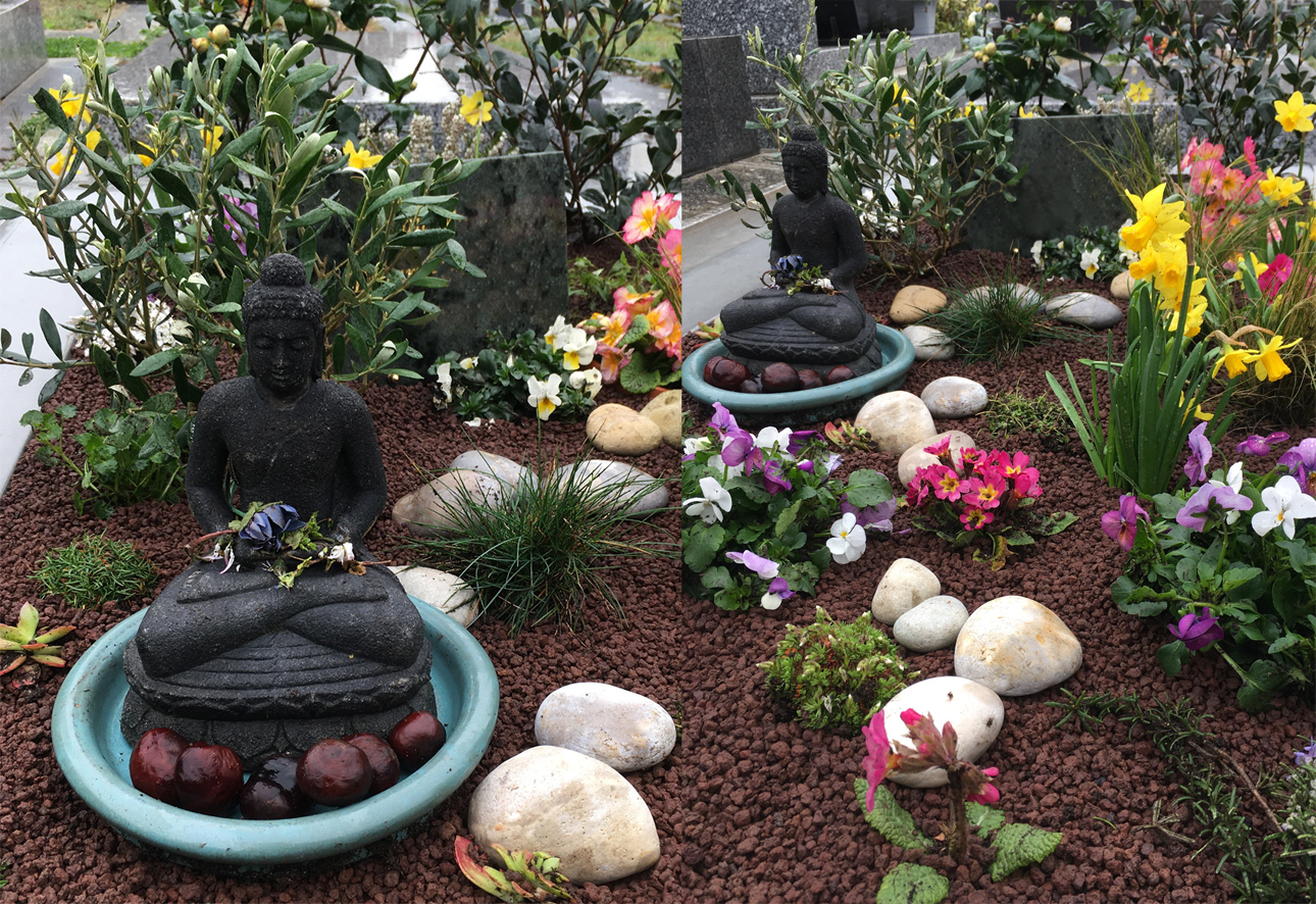 Un sage Bouddha veille sur ce jardin d'éternité. Sépulture paysagère en pleine terre à Sèvres. Mars 2022