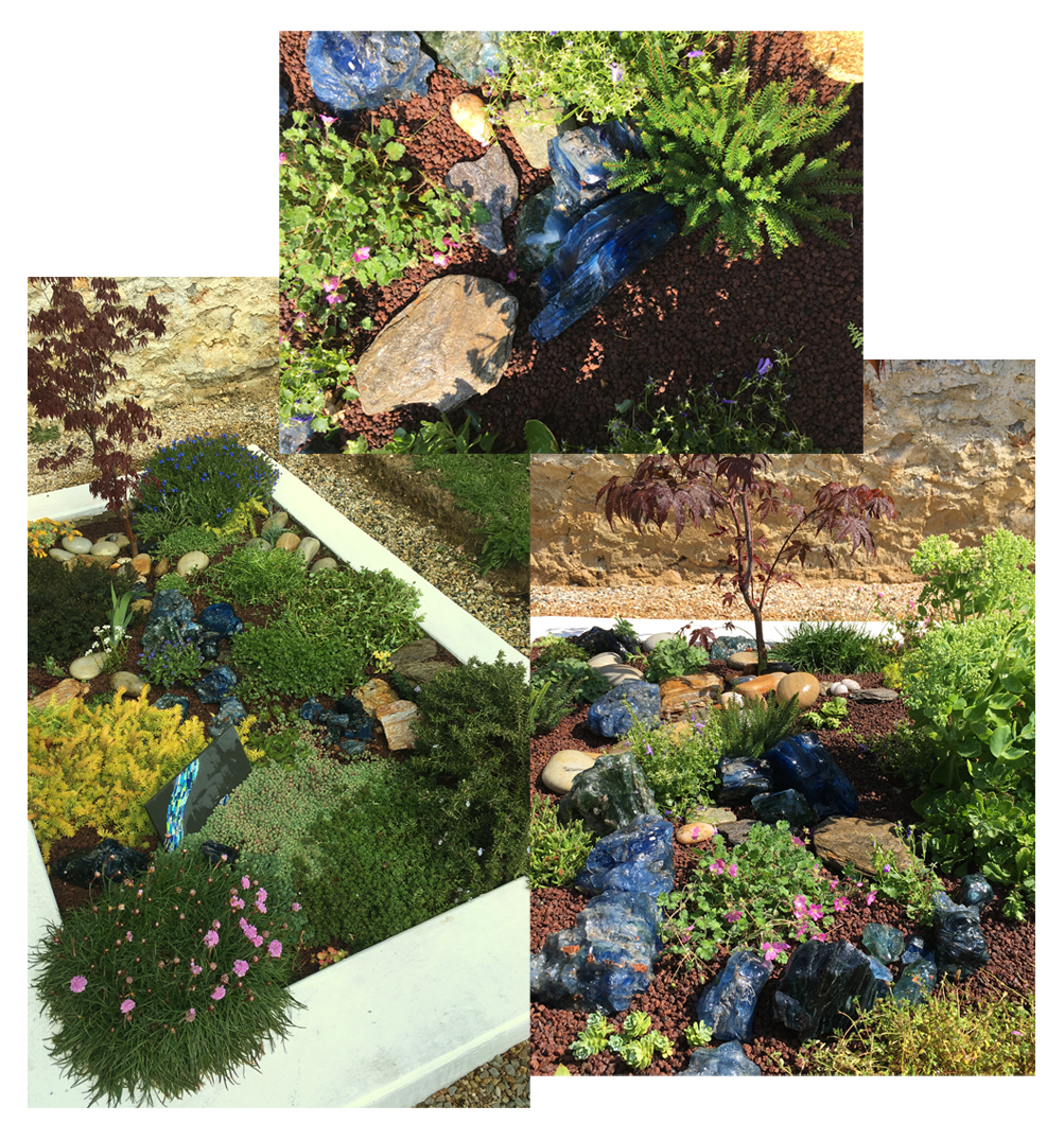 A Mondoubleau, un jardin très bleu avec une création en mosaïque sur la plaque d’ardoise. Le jardin l’été suivant sa réalisation (2013-2014). Sépulture paysagère sur caveau.