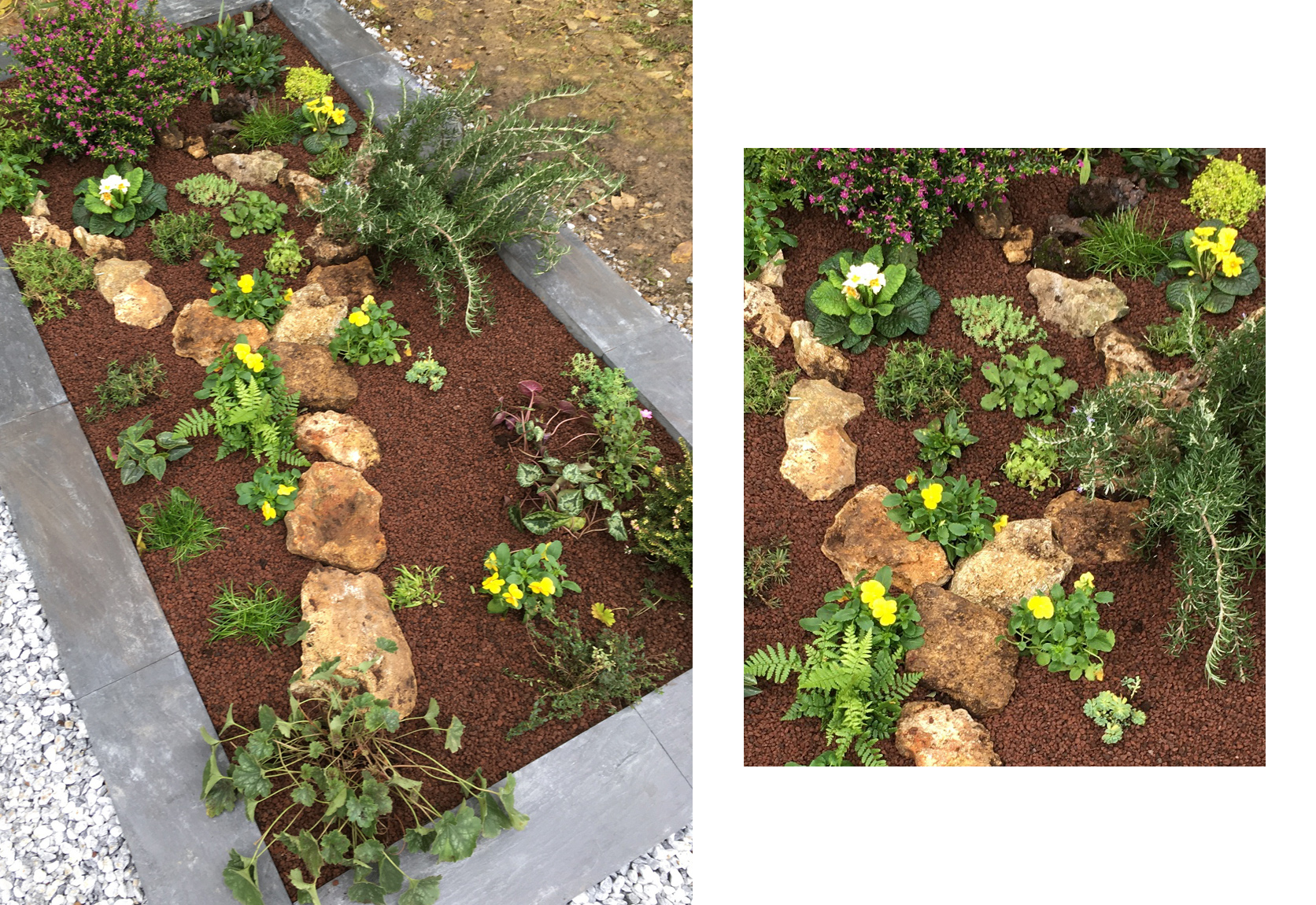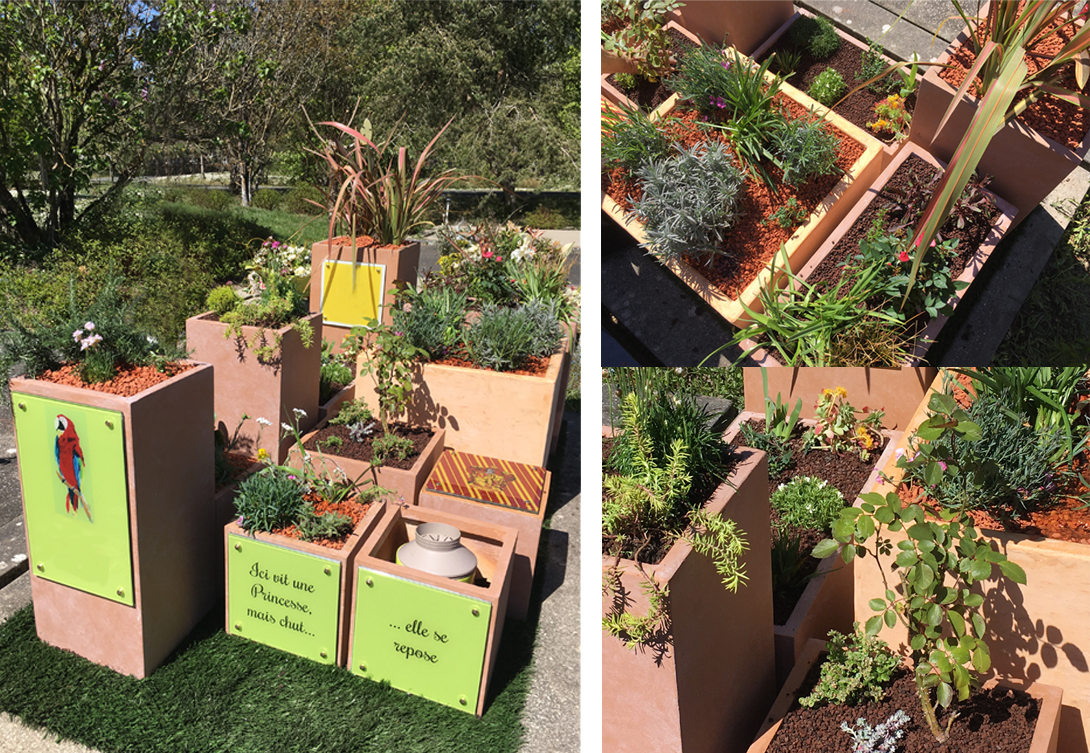 Le projet de jardin a été élaboré à partir d’un tableau de cette artiste peintre qui aimait les couleurs chaudes et vives. Un fusain doré illuminera le jardin toute l’année. Sépulture paysagère sur caveau – Vandœuvre-lès-Nancy, mai 2018