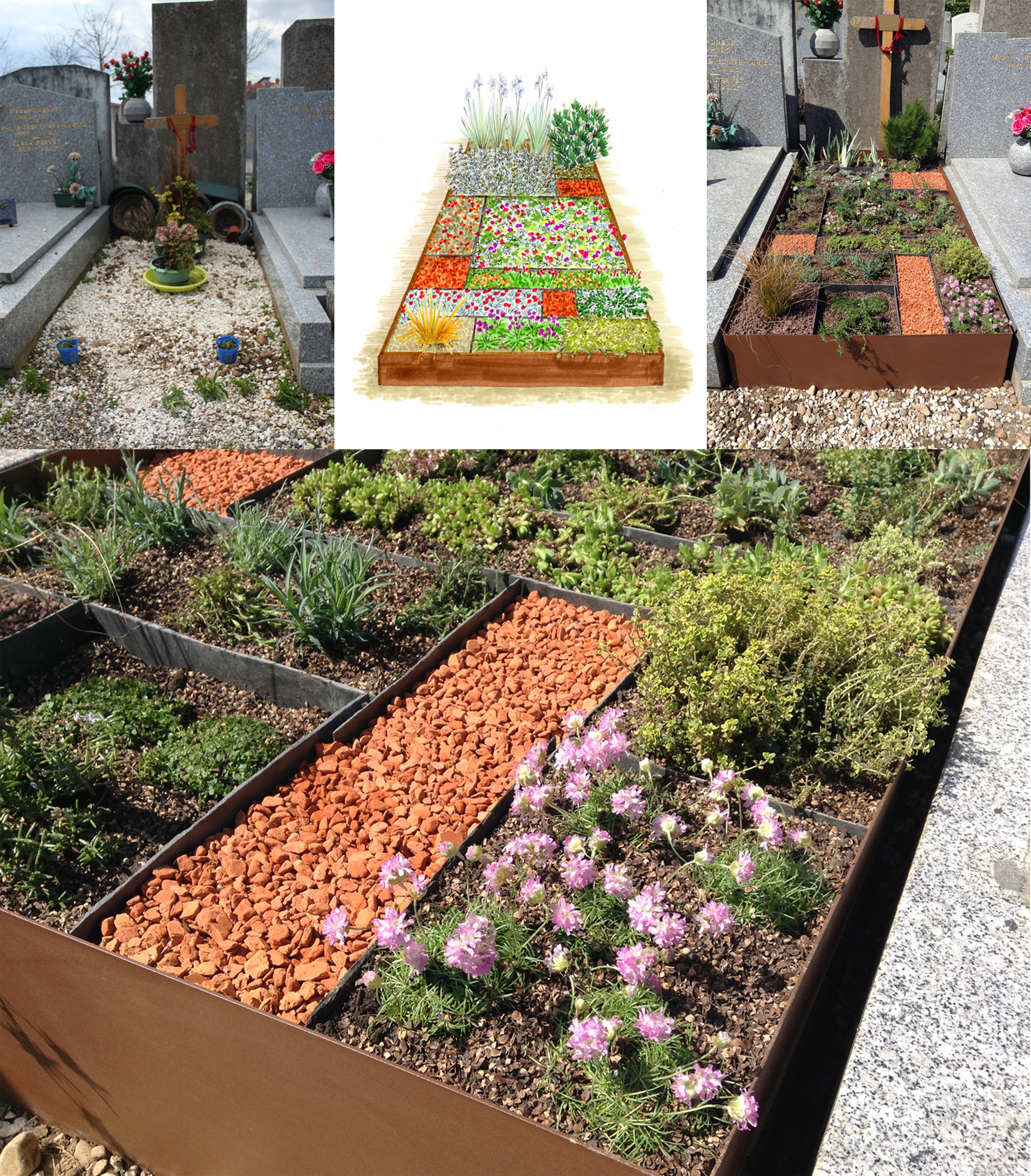 Jardin d’éternité patchwork au cimetière de la Croix-Rousse à Lyon. Un métallier a réalisé sur mesure l’entourage en tôle peinte. Sépulture paysagère en pleine terre – Avril 2015