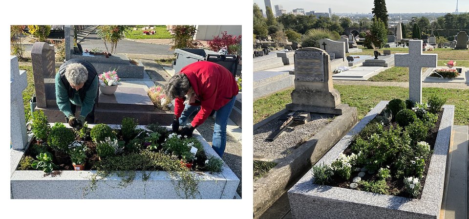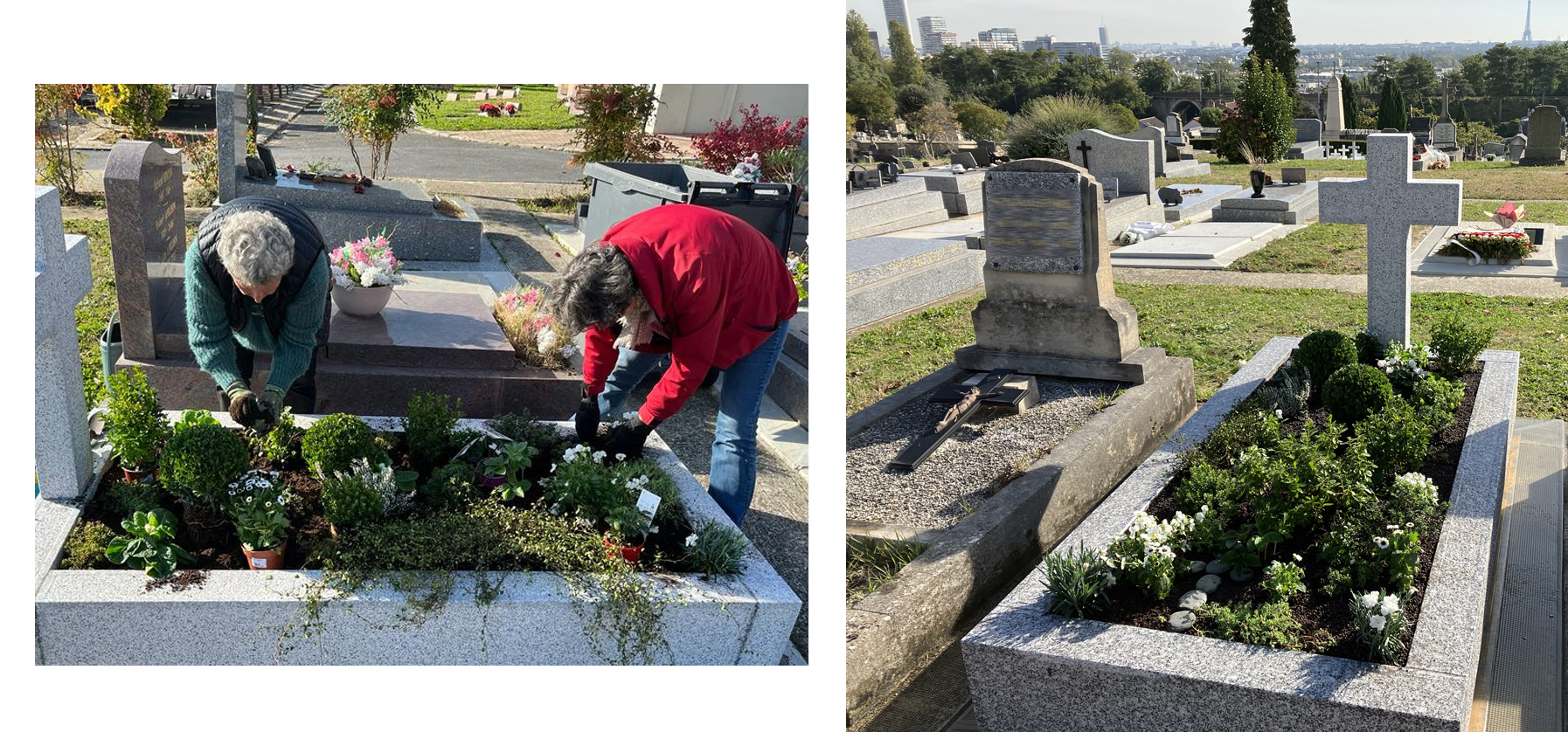 A Suresnes, un jardin tout vert et blanc face à la Tour Eiffel. Sépulture sur caveau. Octobre 2023