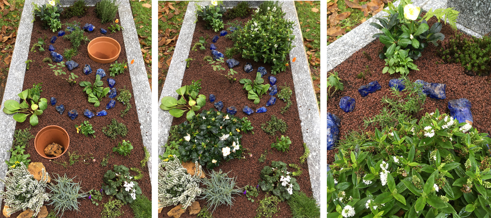 Nos projets prennent vie après un décès et c’est grâce au végétal vivant que de nouveaux liens se créent. Le cycle des saisons offre de multiples rendez-vous sur ce lieu de souvenir devenu unique par sa configuration même. L’interaction avec le jardin contourne la classique contemplation minérale… Une fleur fanée à couper, quelques herbes indésirables à supprimer ou ajouter de nouvelles plantes permet de maintenir la relation entre passé, présent et avenir.