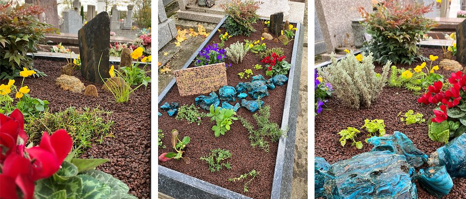 De la Bretagne à la Réunion, plantes et matériaux colorés se côtoient au cœur du jardin de Savigny-sur-Orge. Sépulture sur caveau. Novembre 2023